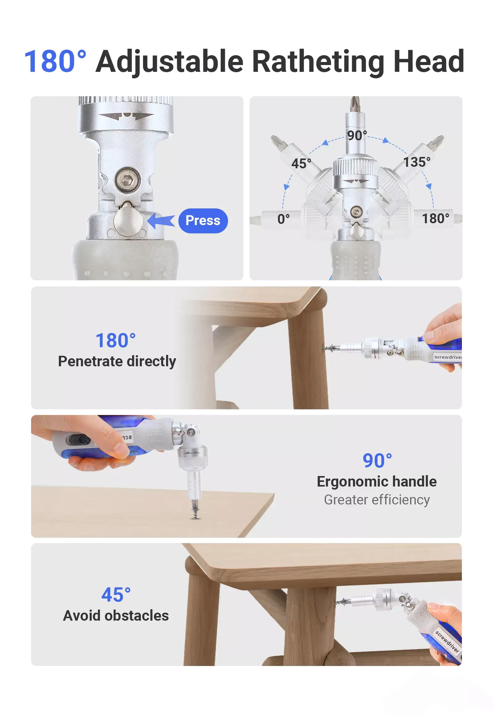180° Adjustable for Tight Space: The 180° rotation of the multi-bit screwdriver head provides users with greater convenience. This design allows easy adaptation to different angles and tight spaces when tightening or loosening screws.