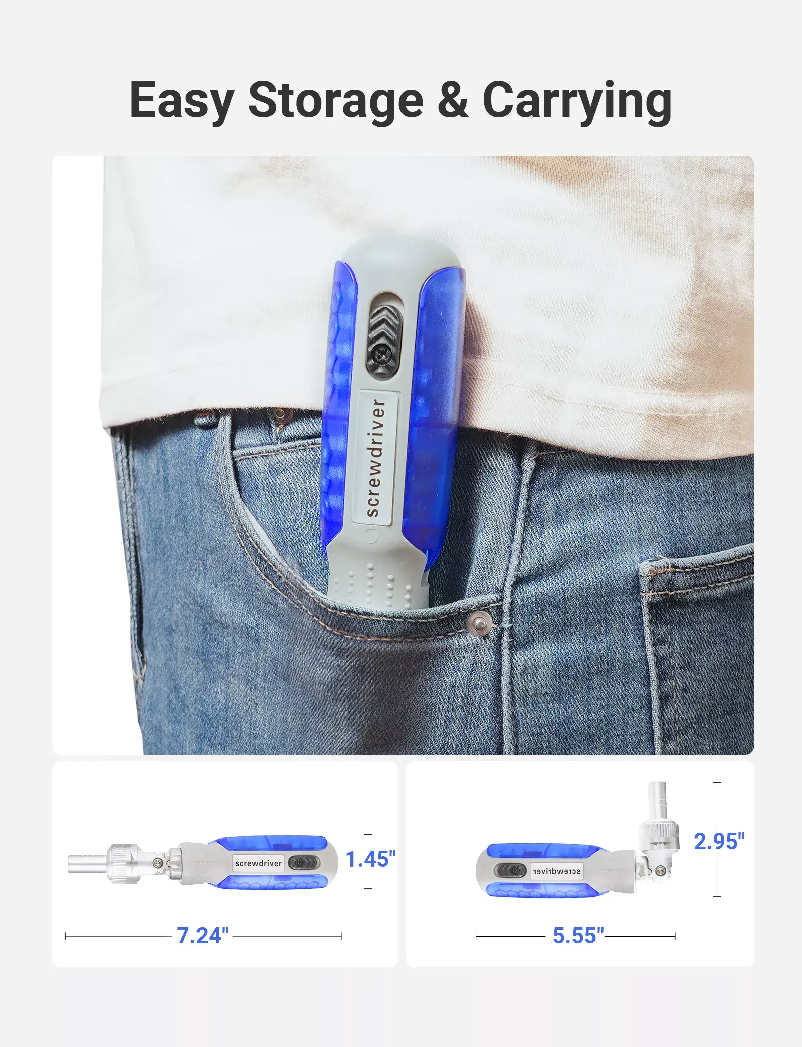 Convenient Internal Bit Holder: All 14 screw bits are neatly stored in the handle for easy access and carry. The onboard storage eliminates the hassle of carrying multiple screwdrivers of different sizes – just one screwdriver covers it all.