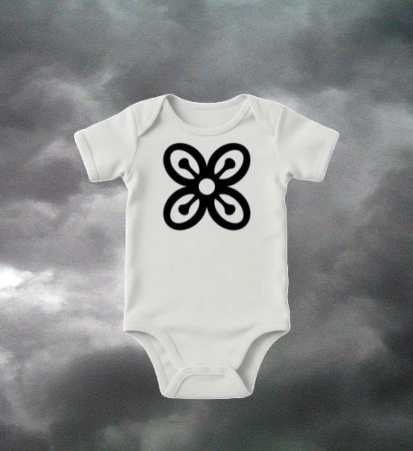 White baby bodysuit with Bese Saka symbol of a bunch of cola nuts. This symbolizes affluence, power, abundance, and plenty; Also a symbol of togetherness and unity.