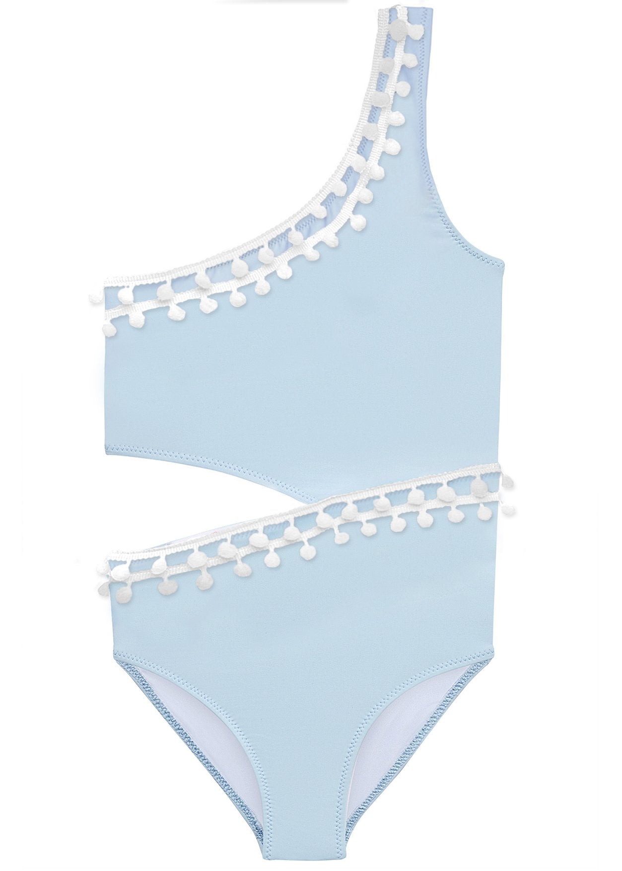 Baby Blue Bathing suit with white pom poms and side cut. See also matching cover ups. Read more