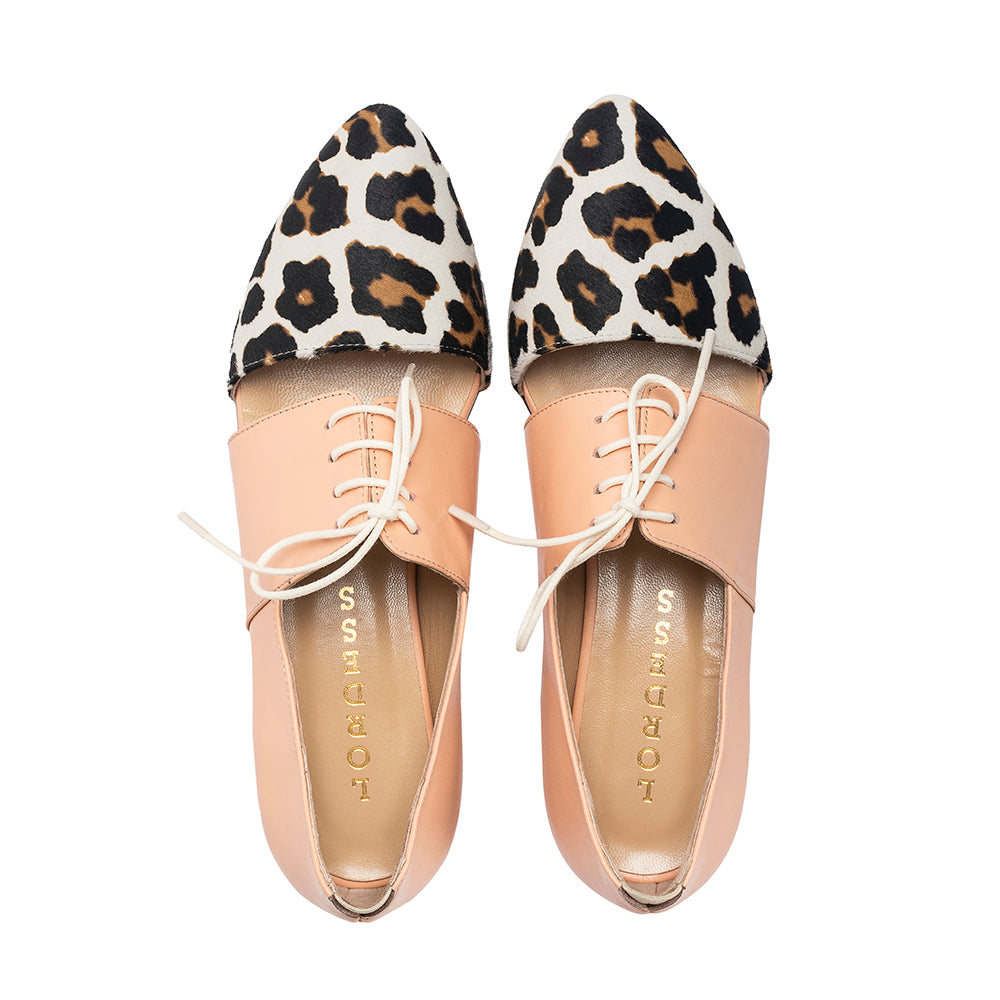Featuring genuine calf hair in a nude color scheme that is delicately paired with soft, pastel peach to charm your senses.