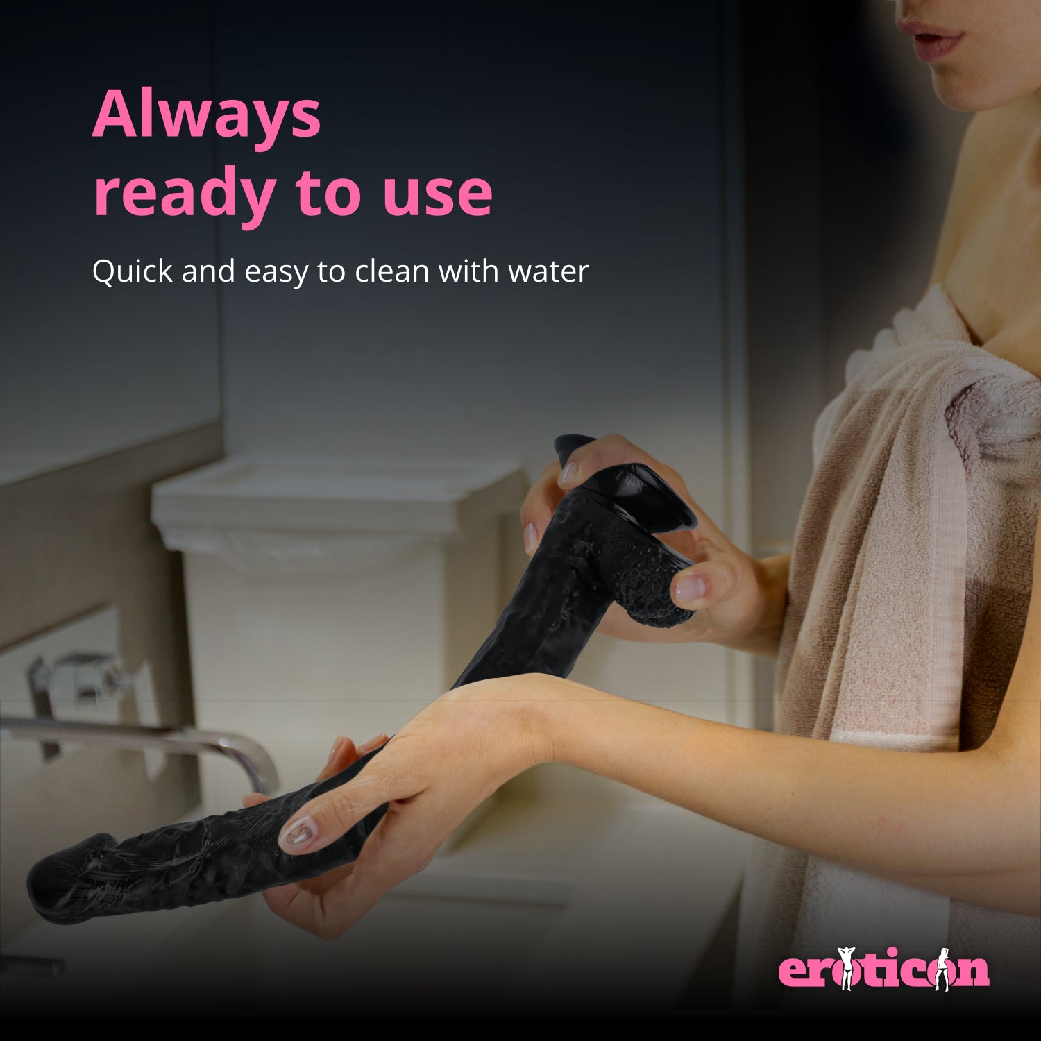 The Mega dildo black by Eroticon is a giant dildo measuring 40 x 4 cm and is almost as big as an average forearm! Because of this, the size is quite similar to a Horse Dildo.