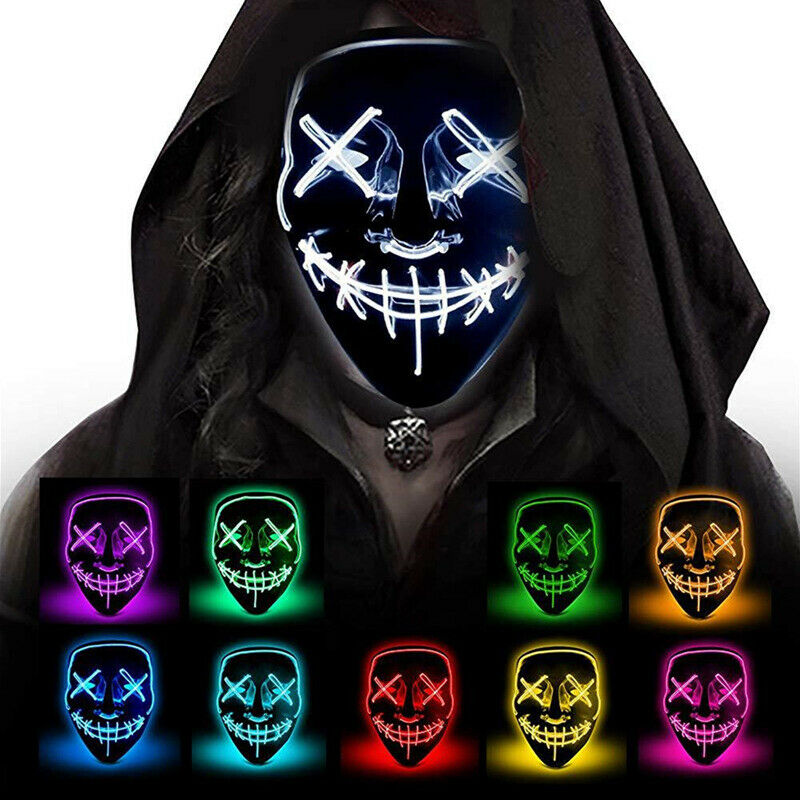High quaity PVC material, coated with el wire on the surface of mask, vivid and funny, powered by 2*AA battery(not included), the mask will bright in the darkness.