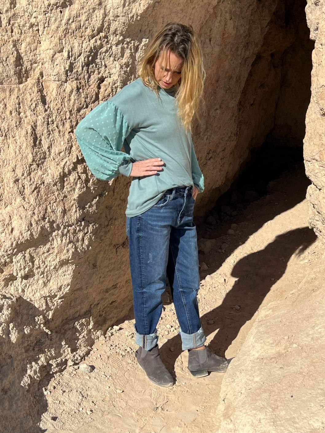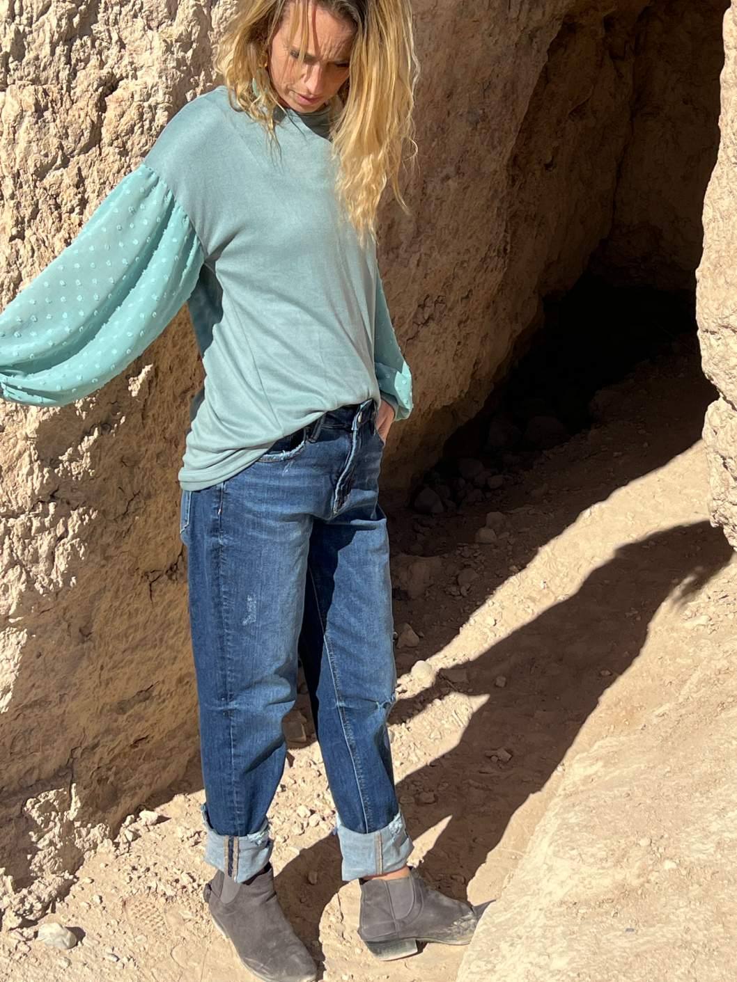 This top- OH-M-GEE!!!! Let me start with the gorgeous sage green color.. the knit is so soft and the chiffon dot swiss is just a gorgeous detail! This is great paired with a necklace and worn with denim or dress up with pants and heels!