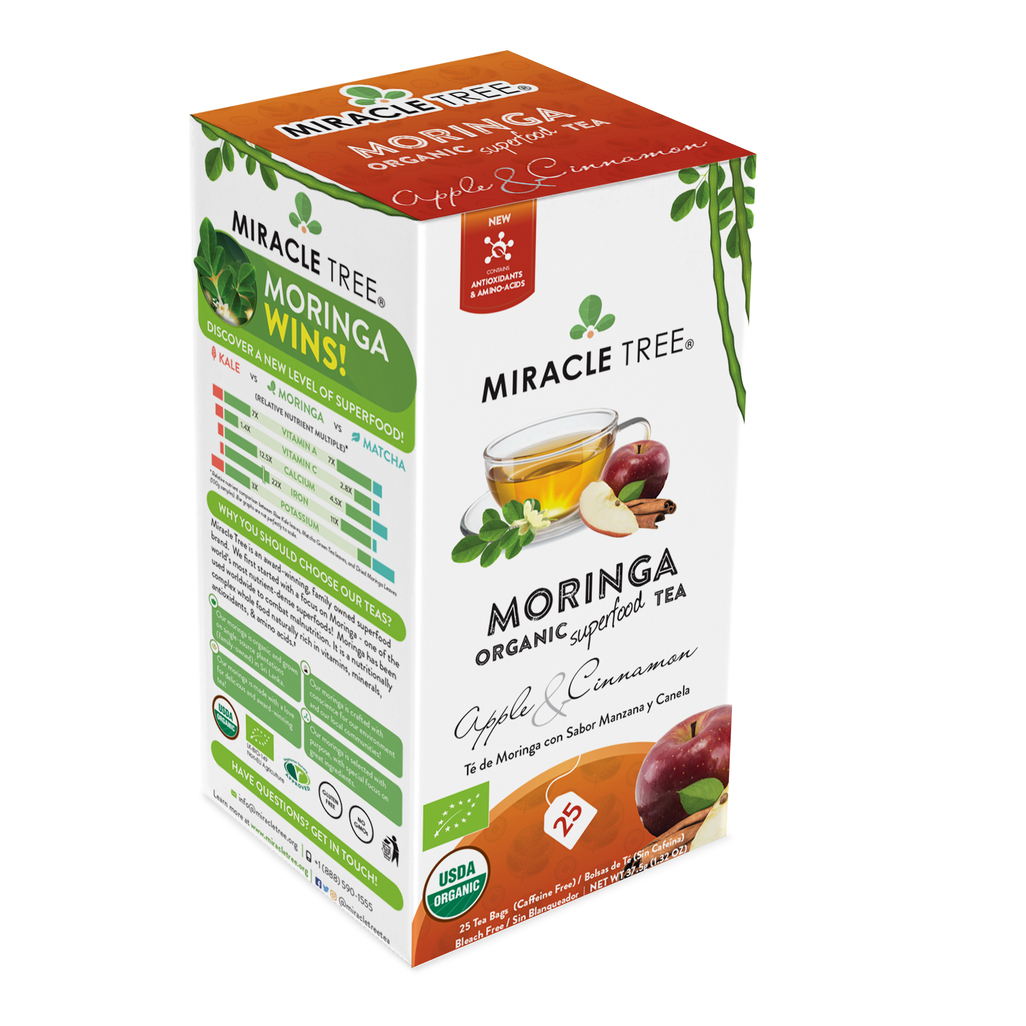 25 WRAPPED TEA BAGS, ORGANIC MORINGA LEAF, NON-GMO, CAFFEINE-FREE, & ABSOLUTELY DELICIOUS. ORGANIC MORINGA TEA: APPLE & CINNAMON. Miracle Tree's Apple & Cinnamon, Organic Moringa Superfood Tea is an yummy herbal infusion expertly blended with the flavor palate with moringa's earthy and bone-dry taste and the sweet and spice of apple and cinnamon.