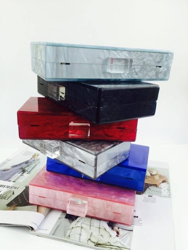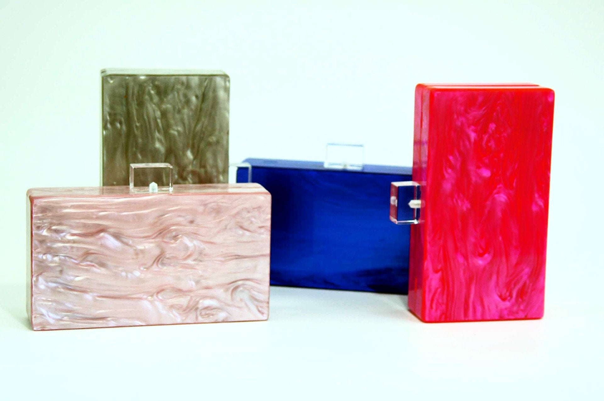 A Colorful Marble Acrylic Box Clutch in marble pattern, trimmed with playful Candy color, accented with clear clap. Creative approach to evening bags.