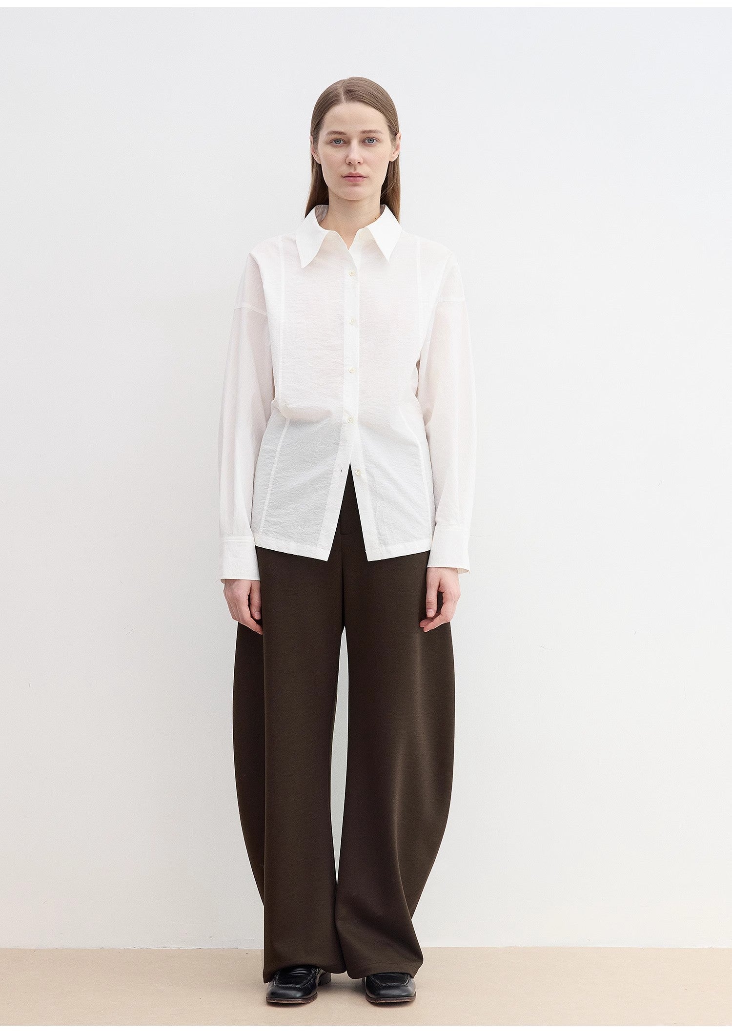 Selected high-quality wool fiber blend, exclusive weaving technology to create texture, dry and comfortable finished garments, skin-friendly, drapey, and three-dimensional cutting to create a three-dimensional curved pants body, side seams moved back to increase the sense of design, with loose pants body fashionable. High waist design visually optimizes proportions and makes you look taller and thinner, and semi-elastic waist design increases practicality, casual, and fashionable.