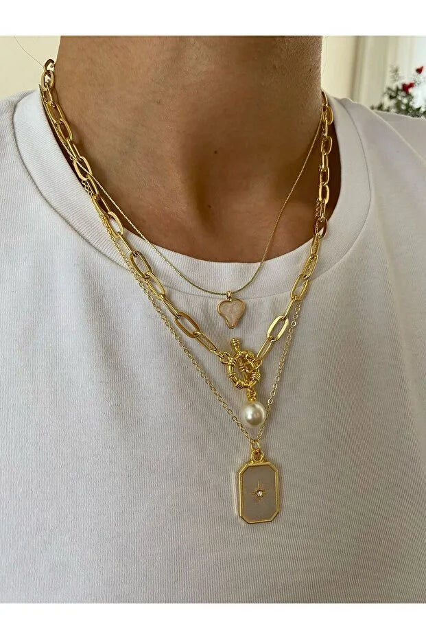 Pole Star Pearl Enamel Necklace Set Three Piece Layered Jewelry