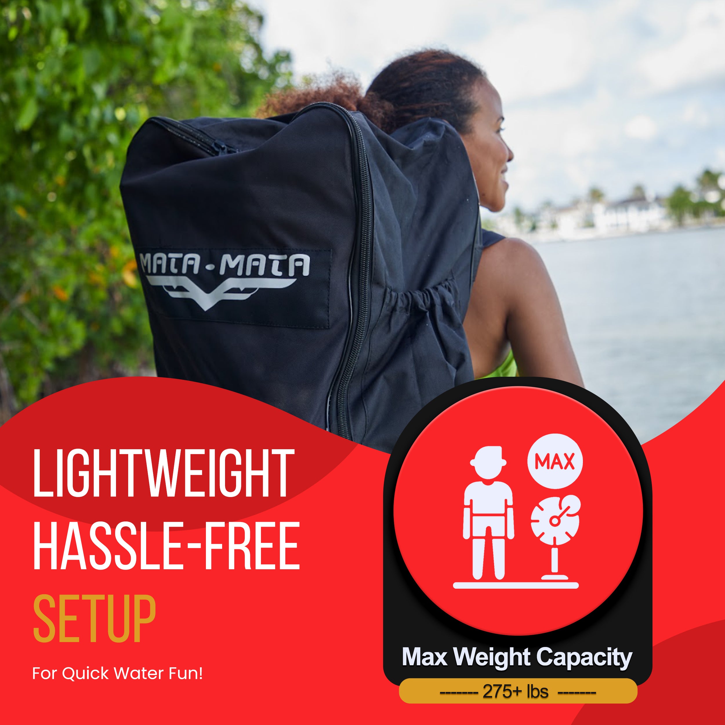 Conquer the waves with the MATA MATA Shark Flight ISUP Paddle Board, inspired by the freshwater Mata Mata turtle of South America. A 10' board with 30” width for unrivaled versatility and stability. Ideal for beginners and pros, Shark Flight offers paddle boarding ease, yoga serenity, and fishing thrills. Virtually indestructible with composite drop stitch core and high-grade PVC, it's more robust than rigid boards. Lightweight, inflatable, and easy to carry with a convenient bag and pump.