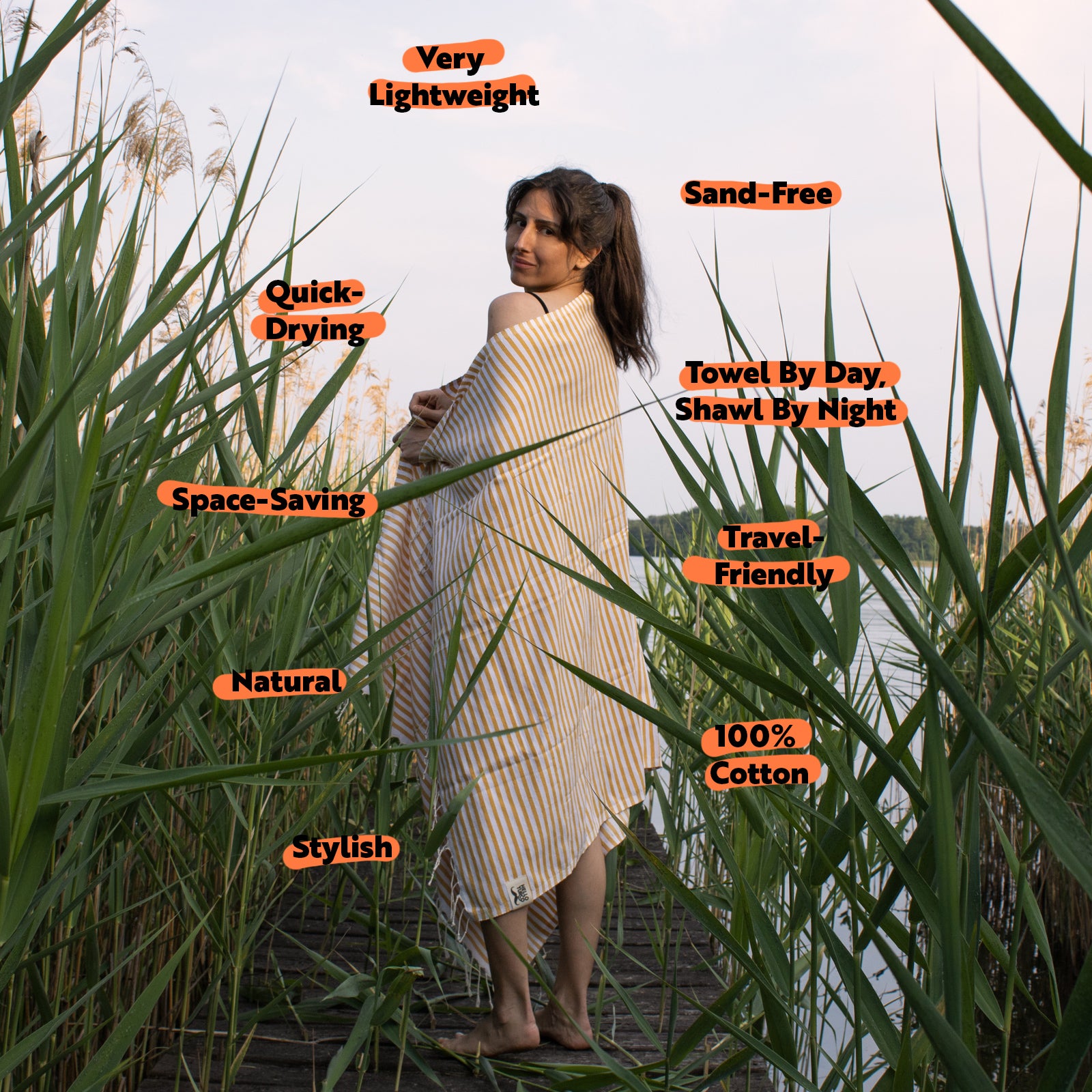 Turkish towels are not only for bath and beach but are also ideal for breastfeeding cover, tablecloth, a boho interior item, light throw blanket, a sarong over swimwear and/or shawl. Also perfect to dry off your soggy puppies and wrap them up to dream.Â