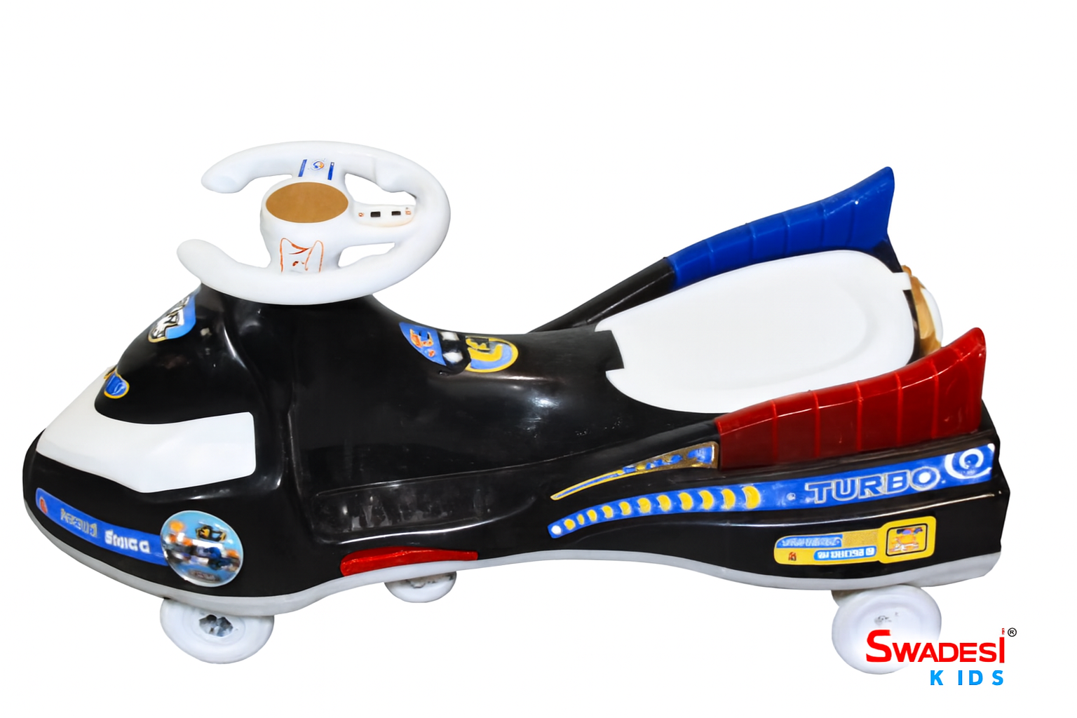 Let your child race into fun with the Swadesi Kids Turbo Ride-On Car. Designed for toddlers and young children, this sporty black ride-on features vibrant red, white, and blue detailing, a contoured white seat for comfort, and a playful steering wheel with colorful accents. Built with durable plastic and smooth-rolling wheels, it encourages active play and motor skill development. Ideal for indoor and outdoor use, this car brings turbo-charged excitement to every ride.