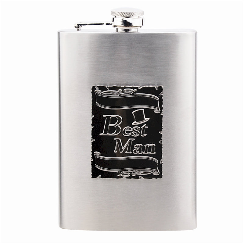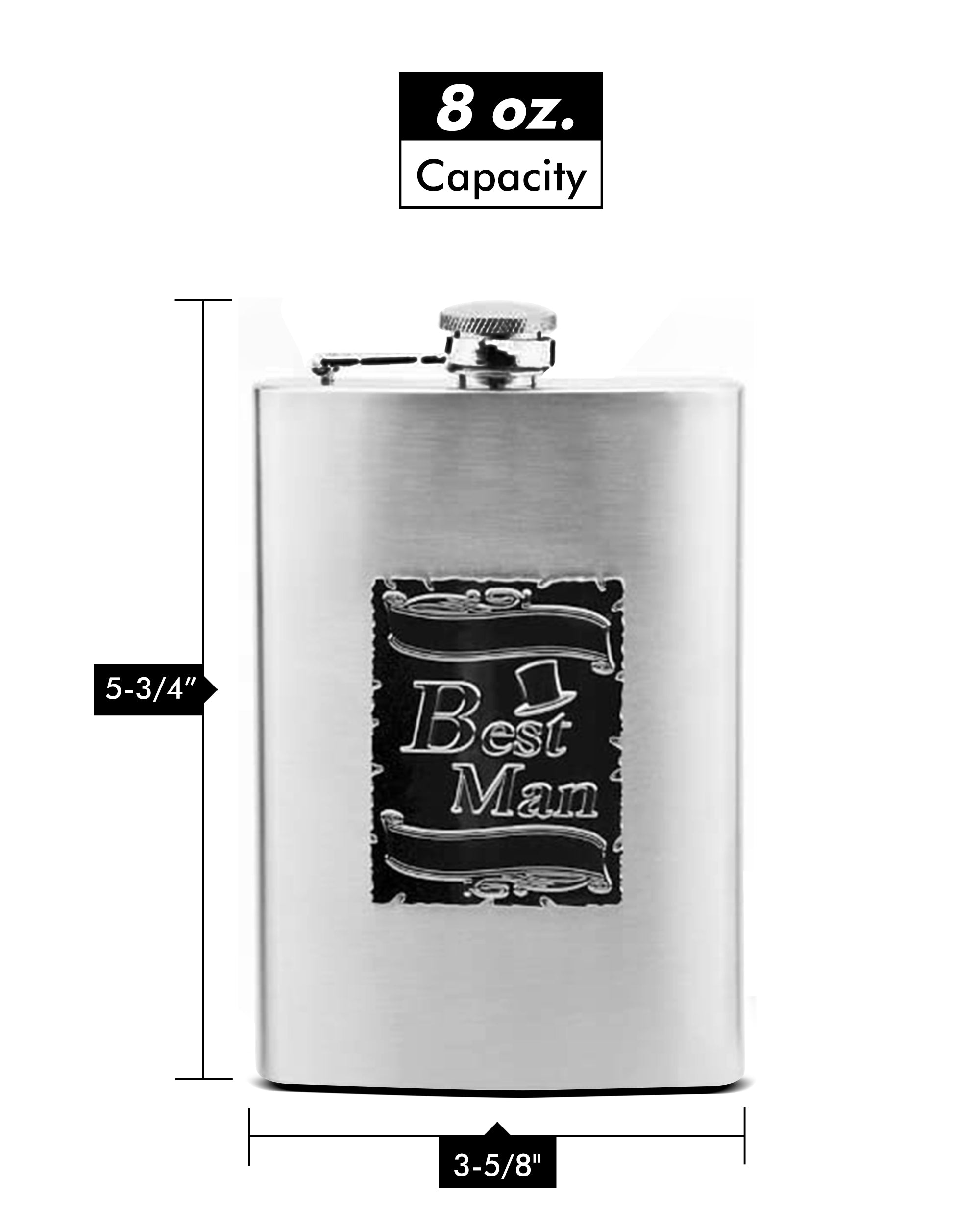 8oz Best Man Gift Flasks with Metal Emblem by Top Shelf Flasksô This genuine stainless steel 8oz flasks features a unique emblem made from quality polished metal that reads "Best Manî This is a perfect gift for the Best Man at any wedding. The high quality materials combined with the uniqueness will make these gifts a special part of your special day.
