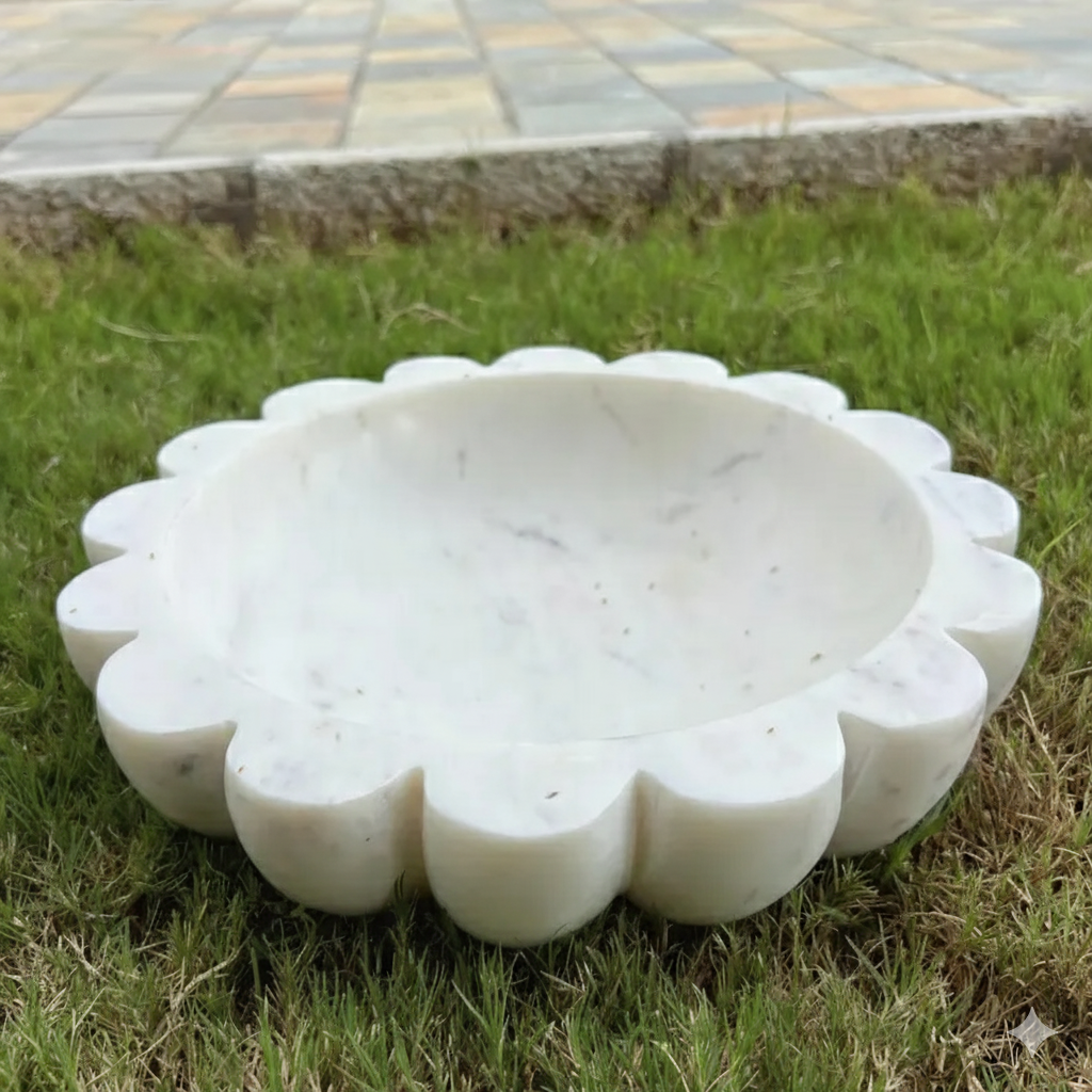 Elevate your outdoor décor with this handcrafted white marble bowl featuring a petal-shaped rim. Ideal for gardens, patios, or indoor... Read more