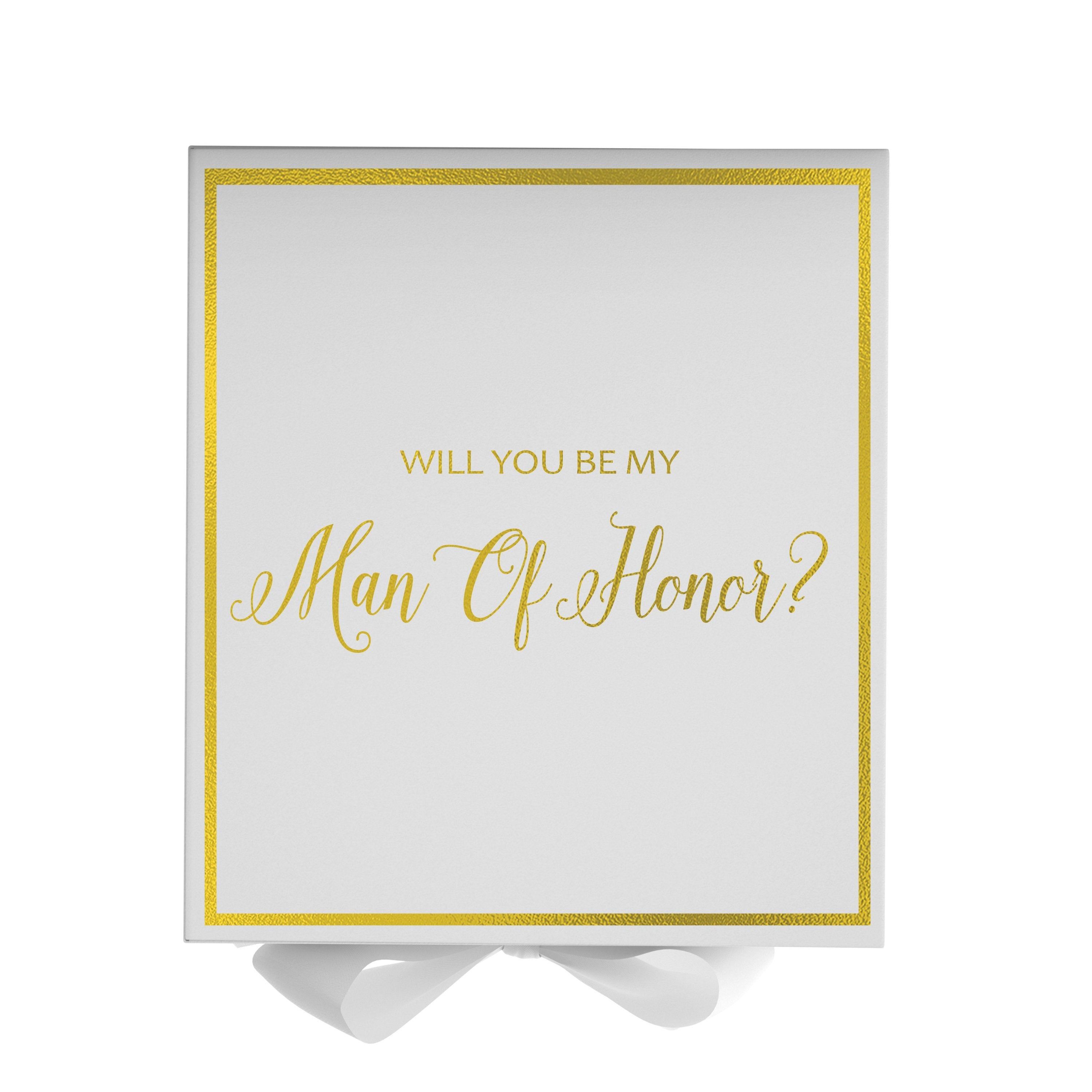 Will you be my Man of Honor, gift box only, metallic writing on lid of box, white box, with White Bow. - Border