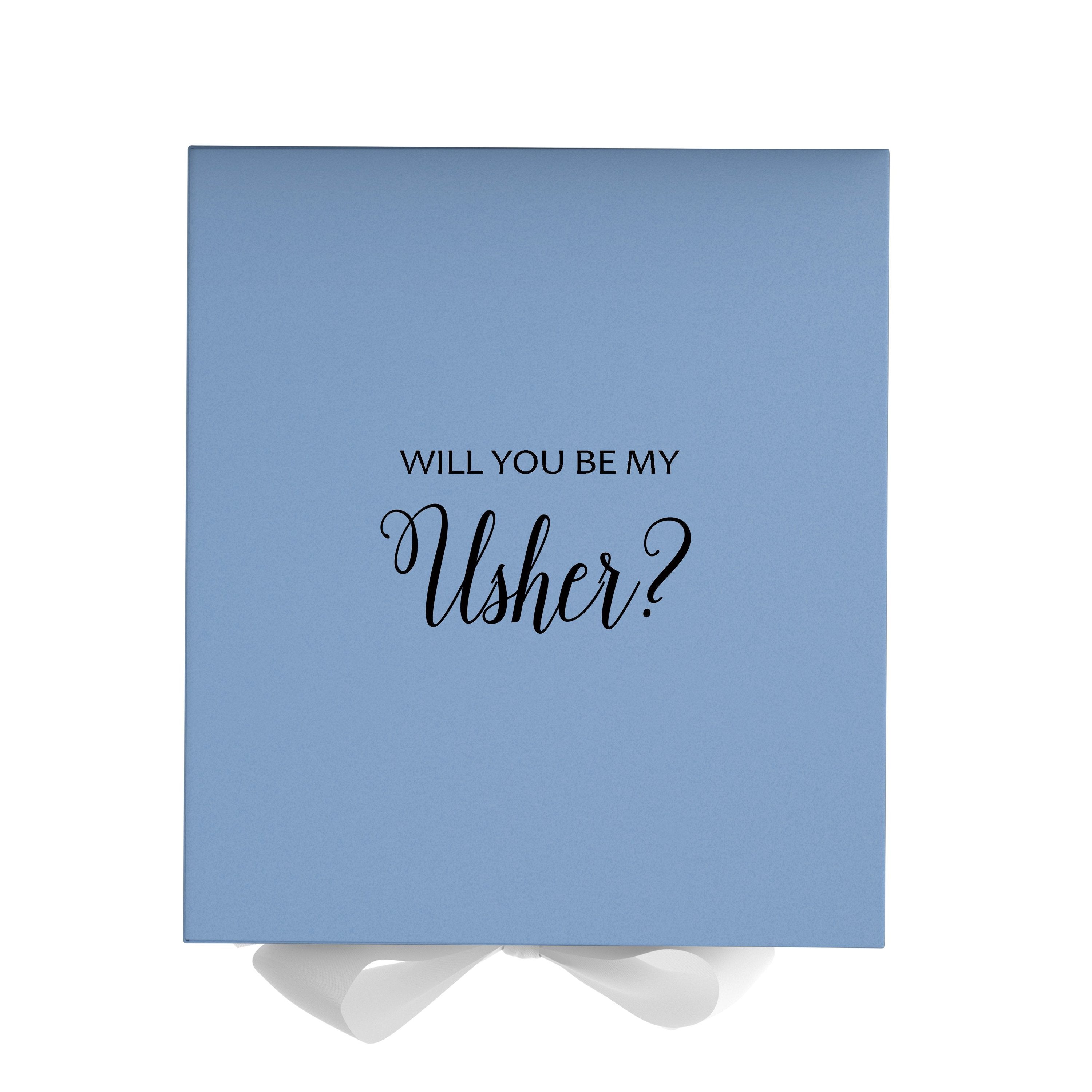 Will you be my Usher, gift box only, metallic writing on lid of box, Light Blue box, with Light Blue w/ White Bow. - No Border