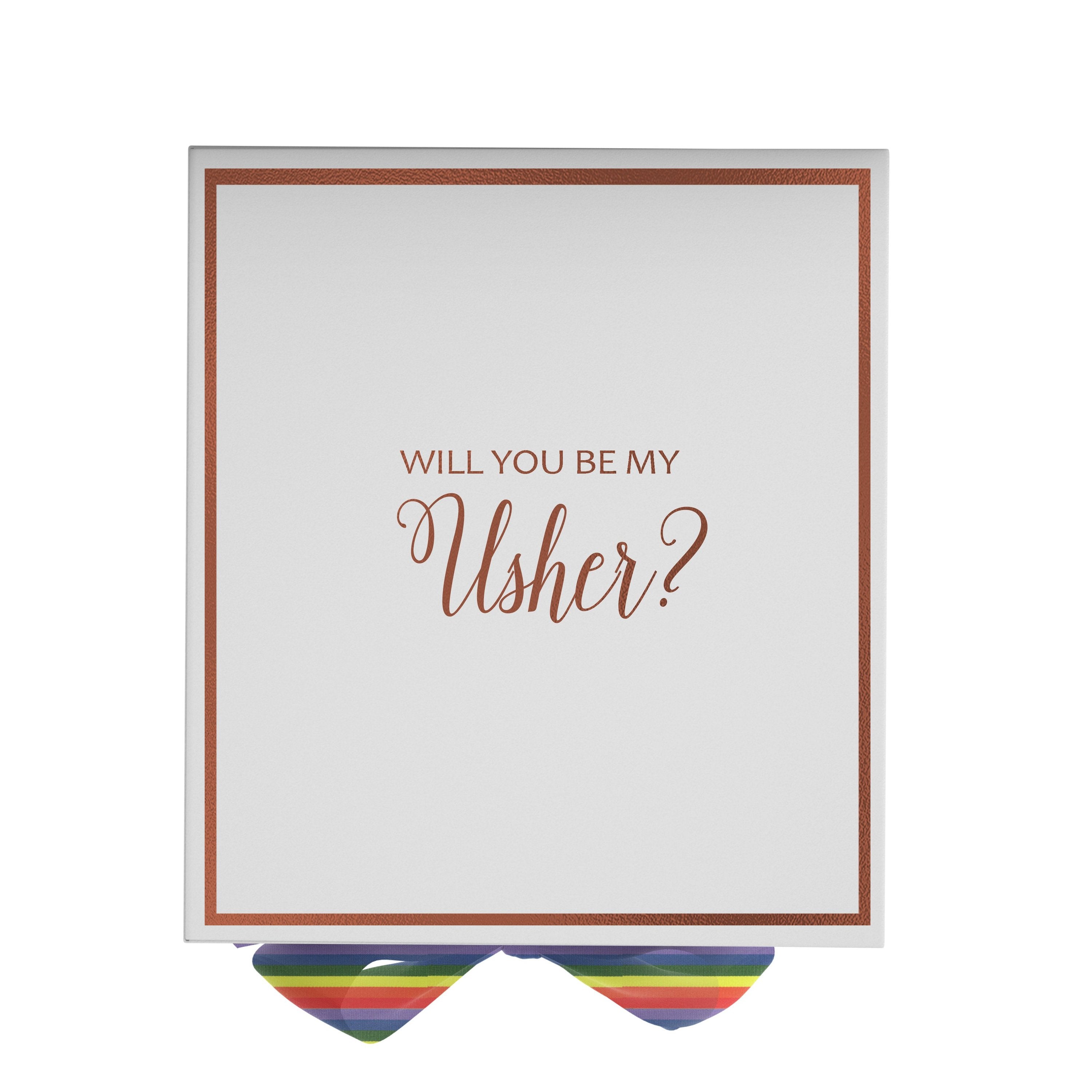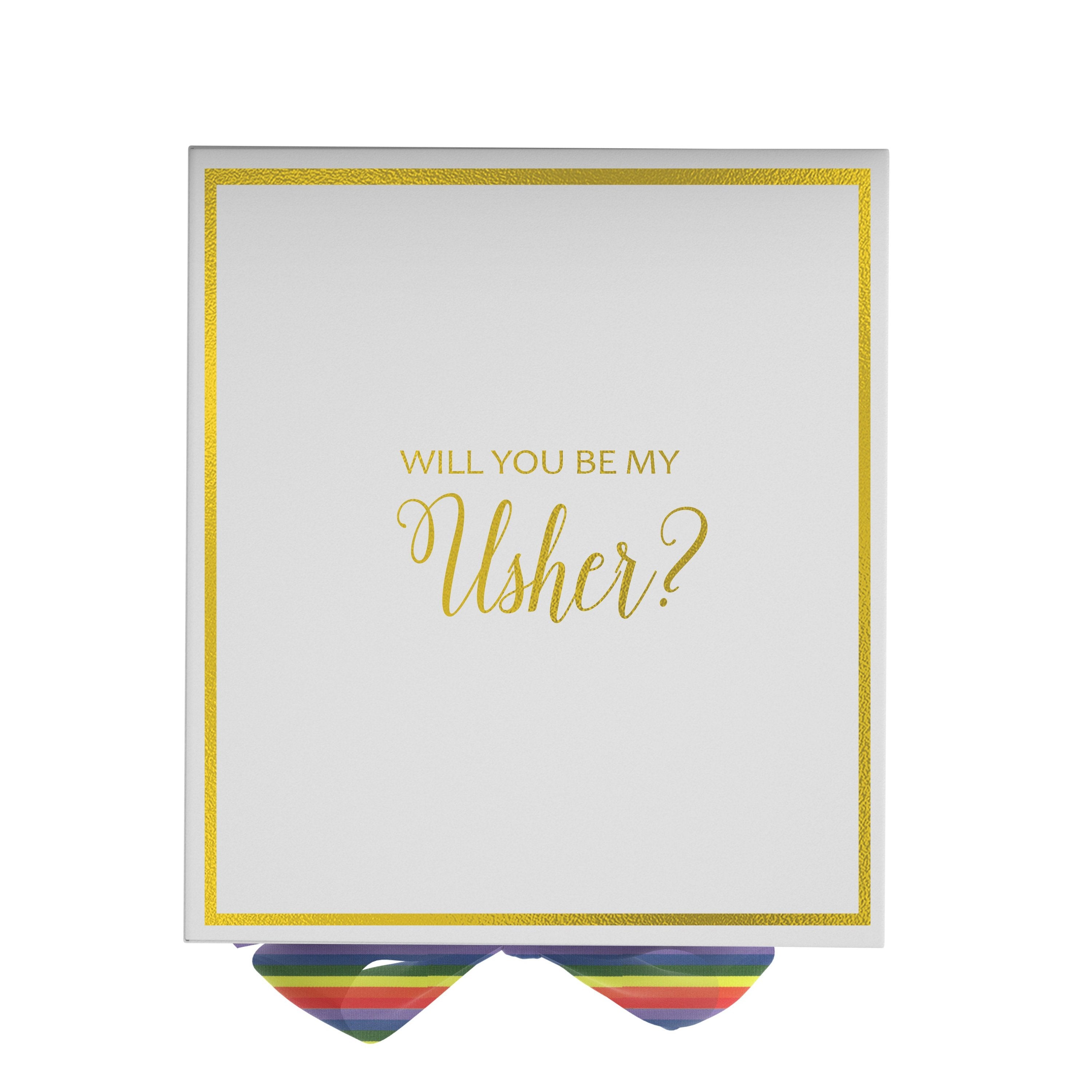 Will you be my Usher, gift box only, metallic writing on lid of box, white box, with Rainbow Bow. - Border
