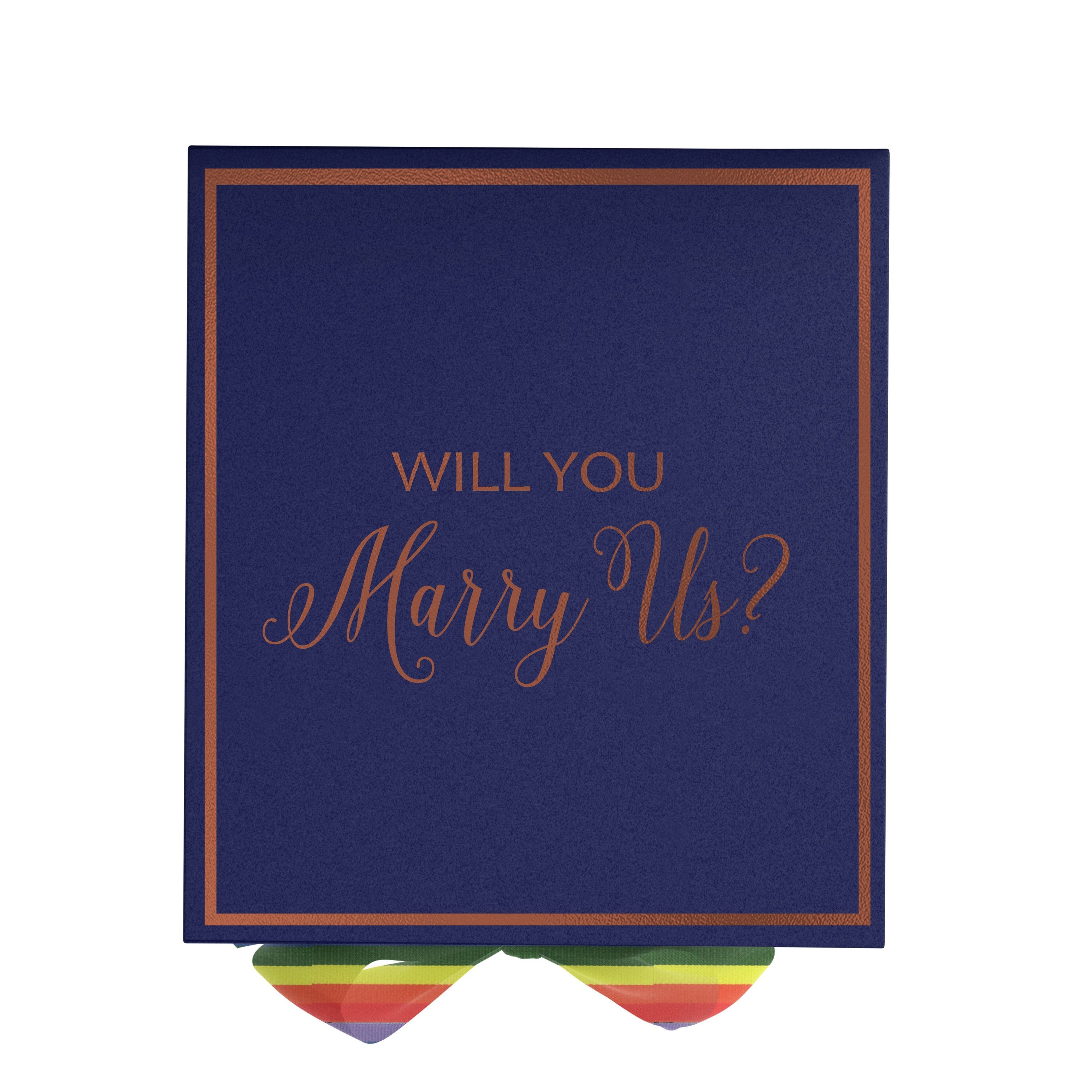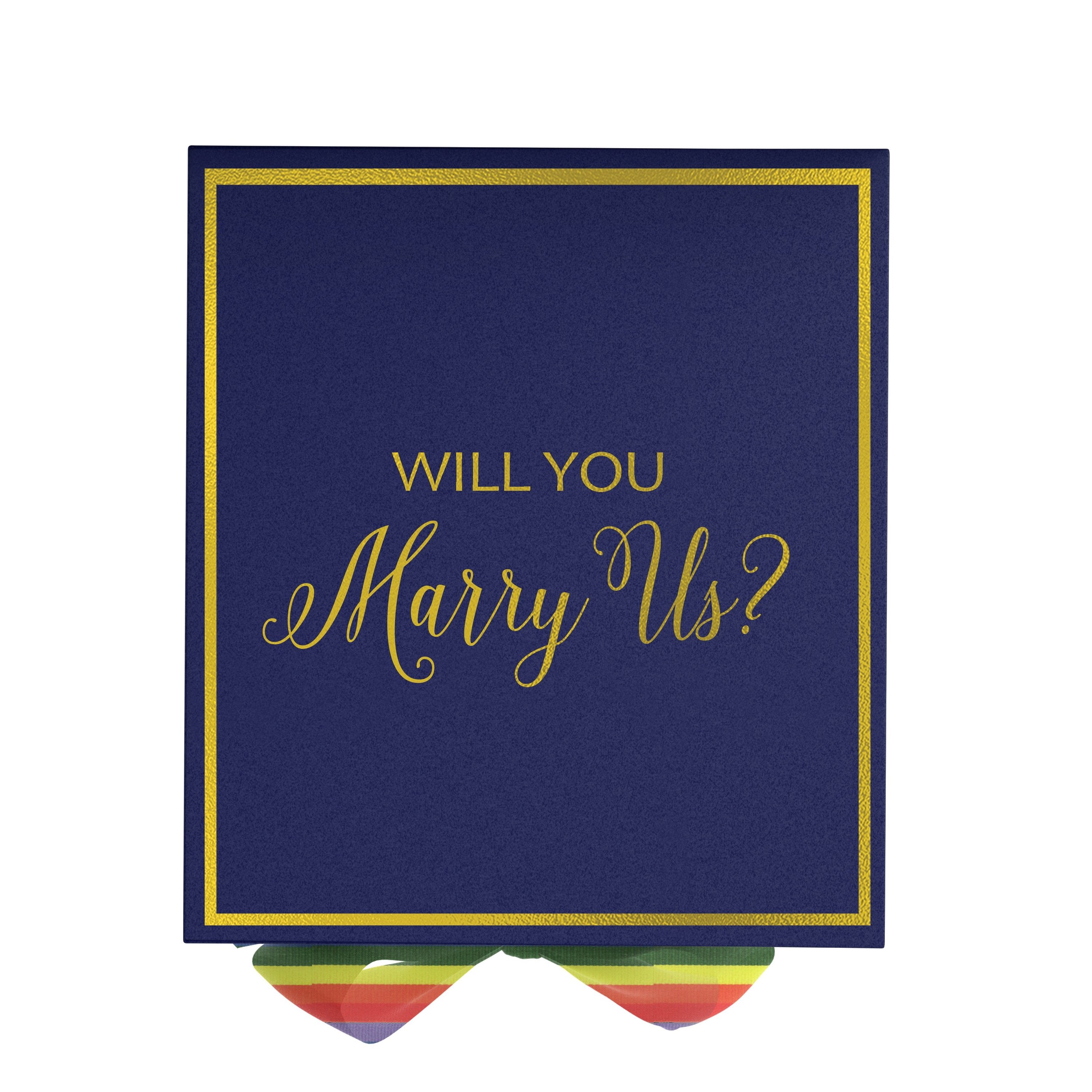 Will You Marry Us?, gift box only, metallic writing on lid of box, Navy box, with Rainbow Bow. - Border